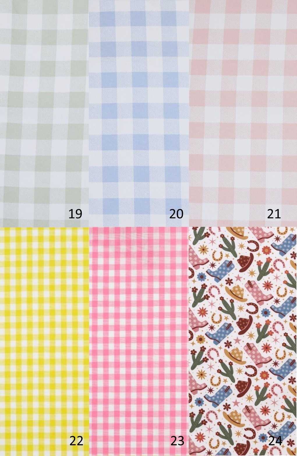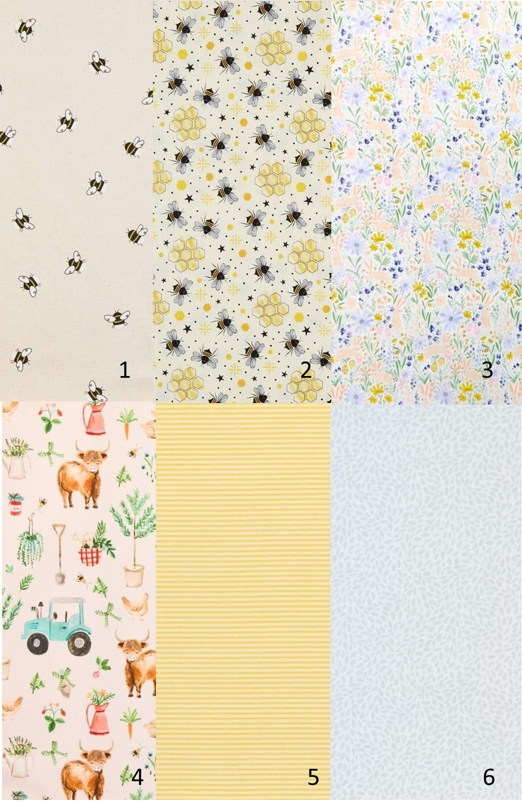 There is a notes section at checkout where you can add your chosen fabrics - you can choose up to two different fabrics, one for the outside main fabric and one for the inside lining fabric. If you would like different fabrics to what is available in the pictures, please get in touch!